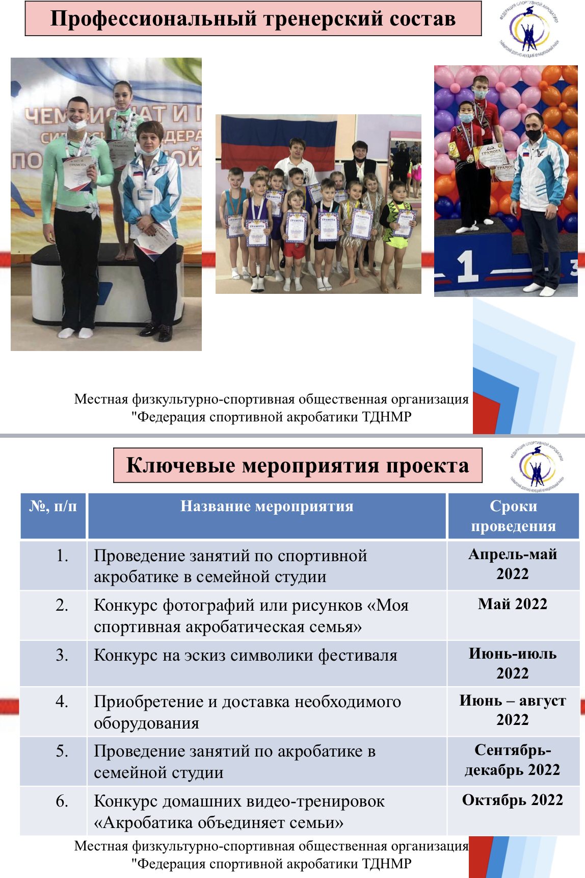 2. Проведение занятий по спортивной акробатике для семей с детьми дошкольного и школьного возраста, проживающих в городе Дудинка, в очном формате.
