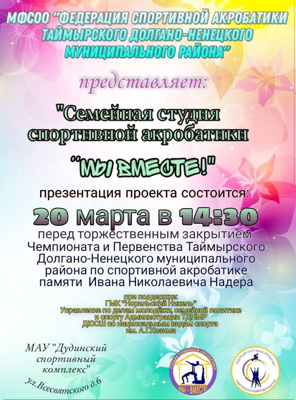 Цель: Создание условий для занятий спортивной акробатикой для семей с детьми дошкольного и школьного возраста на базе действующей секции спортивной акробатики ТМБ ОУ ДО «Детско-юношеская спортивная школа по национальным видам спорта им. А.Г. Кизима» в г. Дудинка.